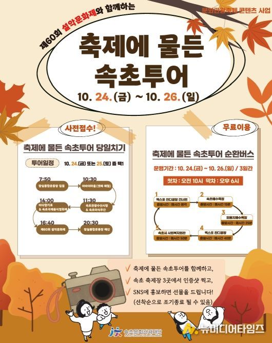 (재)속초문화관광재단은 제60회 설악문화제를 맞아 수도권 시민들이 가을 정취 가득한 속초의 대표 축제들을 한 자리에서 체험할 수 있도록 특별 기획된 문화관광 콘텐츠 ‘축제에 물든 속초투어’를 운영한다.