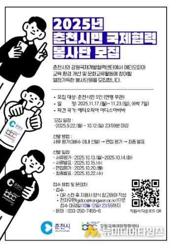 춘천시는 강원국제개발협력센터와 함께 ‘2025 춘천시민 국제협력봉사단’을 창단해 오는 11월 에티오피아 아디스아바바에 파견한다.