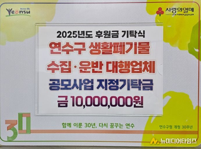 연수구 관계자는 “쾌적하고 깨끗한 도시환경 조성을 위해 힘쓰고 있는 연수구 생활폐기물 수집·운반 대행업체의 따뜻한 나눔에 감사하다.”라며 “전달받은 성금은 도움이 필요한 이웃들에게 소중히 전달해 따뜻한 위로와 희망을 전하겠다.”라고 밝혔다.