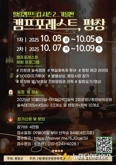 평창관광문화재단은 바위공원 힐링 프로그램 운영 사업을 통해 가을철 자연 속 힐링과 체험을 결합한 가족 단위 캠프 프로그램, '캠프포레스트, 평창'의 참가자를 모집한다. 행사는 오는 10월 3일부터 9일까지 평창군 평창읍 바위공원 일대에서 진행된다.