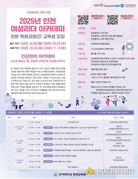 인천광역시는 역량 있는 여성 인재를 발굴하고 육성하기 위해 인하대학교 평생교육원과 함께 ‘2025 인천 여성리더 아카데미’ 두 번째 전문・특화과정인 ‘건강관리 아카데미’ 교육생을 모집한다고 밝혔다.