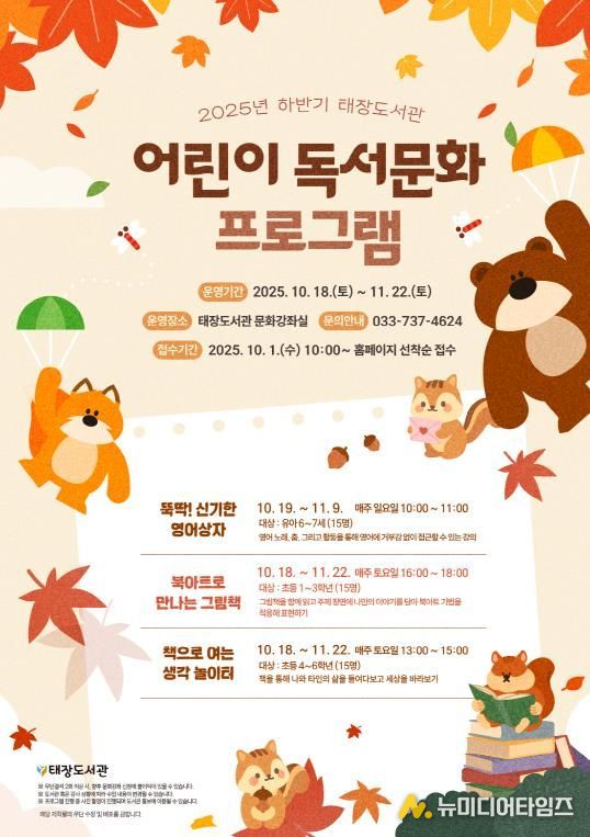 원주시 태장도서관은 관내 어린이들을 대상으로 2025년 하반기 어린이 독서문화 프로그램을 운영한다.