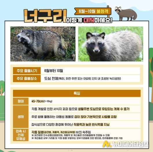 구 관계자는 “너구리가 굴포천 생태 환경이 개선되며 그 주변으로 서식지를 넓혀감에 따라, 발견 신고가 늘고 있다”며 “너구리는 포획 대상도 아니고 유해동물로 지정되어 있지 않지만, 접촉할 경우 광견병 등 각종 질병을 옮길 수 있어 접촉을 피해 주시기를 바란다”고 전했다.