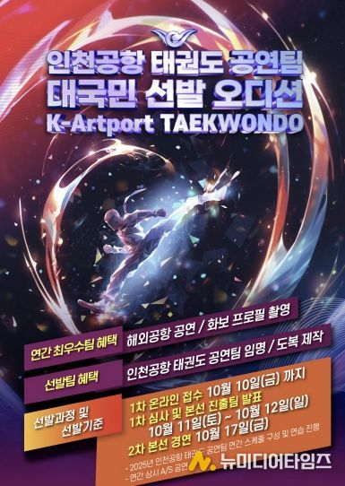 인천국제공항공사는 인천공항에서 진행되는 태권도 상설공연인 ‘2025-2026 인천공항 태권도 상설공연’에 참여할 태권도 전문 공연팀을 공개 모집한다고 28일 밝혔다.