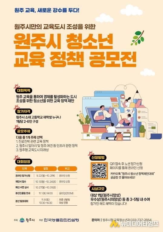 원주시는 지역 청소년들이 직접 제안한 정책을 바탕으로 교육도시 비전을 함께 만들기 위해 ‘원주시 청소년 교육 정책 공모전’을 추진한다.