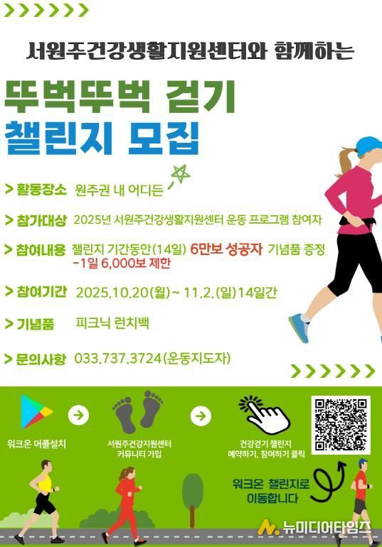 서원주건강생활지원센터는 지역 주민들의 건강 증진과 걷기 습관 형성을 돕기 위해 10월 20일부터 11월 2일까지 14일간 ‘뚜벅뚜벅 걷기 챌린지’를 운영한다.