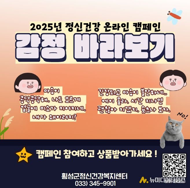 횡성군정신건강복지센터 서준호 센터장은“이번 캠페인을 통해 군민들이 자신의 감정을 올바르게 인식·이해하고 스트레스를 건강하게 극복할 수 있길 바란다”며“앞으로도 정신건강 자가관리 역량을 높이는 다양한 프로그램을 이어가겠다”고 말했다.