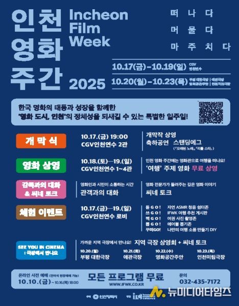 인천시가 주최하고 인천시영상위원회가 주관하는 이번 ‘인천 영화 주간 2025’는 ‘여행’을 주제로 10월 17일부터 23일까지 인천 전역에서 개최되며, 영화 도시 인천의 정체성을 새롭게 발견하고 시민 누구나 함께 즐길 수 있는 복합 영화 축제다.