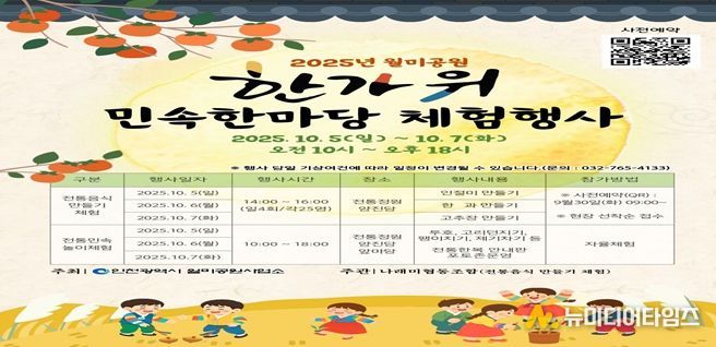 인천광역시 월미공원사업소는 오는 10월 5일부터 7일까지 3일간 월미공원 내 전통정원(양진당)에서 ‘한가위 민속한마당 체험행사’를 개최한다고 밝혔다.