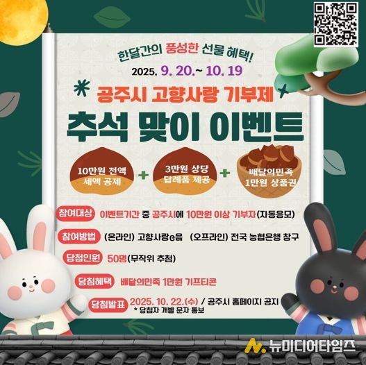 공주시는 추석을 앞두고 고향사랑기부 모금 활성화를 위해 ‘추석맞이 이벤트’를 진행한다고 29일 밝혔다.