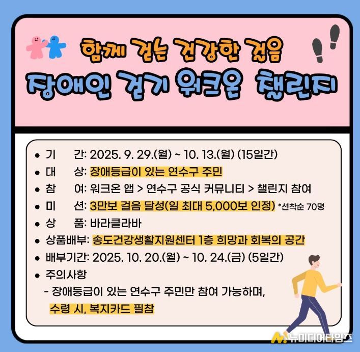 연수구가 지역 장애인의 건강 증진과 자가 건강관리 능력 강화를 위해 ‘함께 걷는 건강한 걸음, 장애인 걷기 워크온 챌린지’를 운영한다.