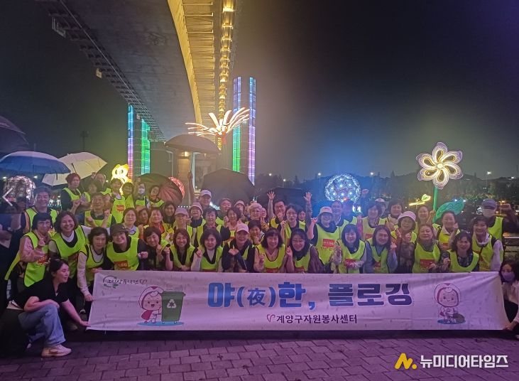 인천 계양구자원봉사센터는 지난 24일 저녁, ‘계양아라온 아트웨이(빛의 거리 3단계)’와 ‘가을꽃 국화축제’가 열리는 현장에서 자원봉사자 74명과 함께 ‘야(夜)한 플로깅’ 봉사활동을 진행했다.