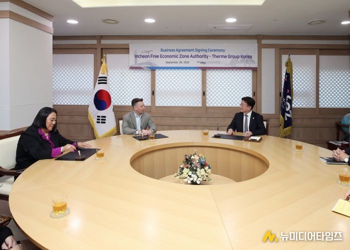 인천경제자유구역은 29일 오후 송도지타워에서 윤원석 인천경제자유구역청장, 스텔리안 야콥(Stelian Iacob) 테르메그룹 부회장, 김인숙 테르메그룹코리아 대표 등이 참석한 가운데 ‘테르메 힐링&스파 리조트’ 사업 기본협약을 체결했다고 밝혔다.
