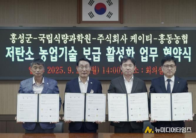 홍성군은 29일, 국립식량과학원, KT(케이티), 홍동농협과 함께 저탄소 농업기술 보급 활성화를 위한 4자간 업무협약(MOU)을 체결했다고 밝혔다.