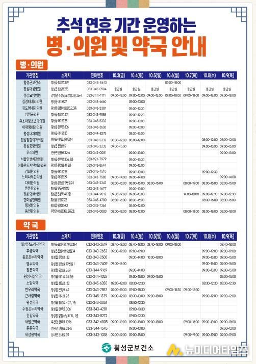 또한, 추석 당일인 10월 6일에는 횡성군보건소에서 오전 9시부터 오후 6시까지 일반진료를 실시하여 군민들의 의료서비스 불편을 최소화할 방침이다.