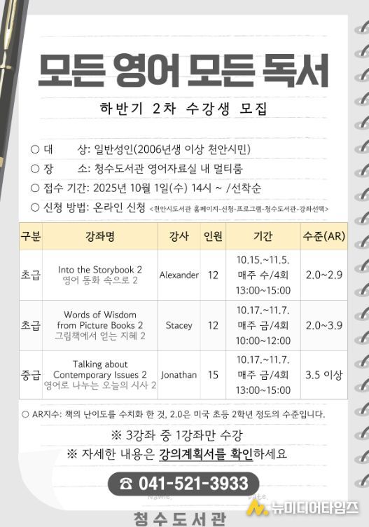 천안시 청수도서관은 내일 1일부터 성인 영어 프로그램 ‘모든 영어 모든 독서’ 수강생을 모집한다고 30일 밝혔다.