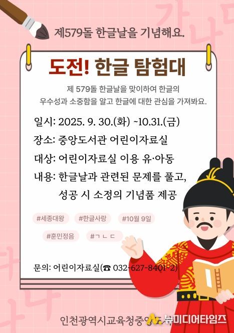 인천광역시교육청중앙도서관은 제579돌 한글날을 맞아 9월 30일부터 10월 31일까지 어린이들이 즐겁게 한글을 배우고 도서관을 체험할 수 있는 특별행사 ‘도전! 한글 탐험대!’를 운영한다.