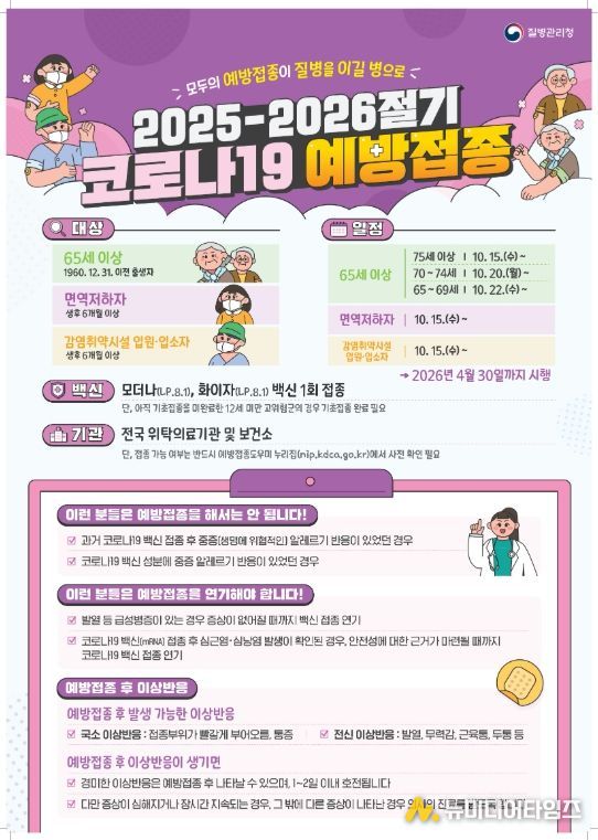 이번 접종은 65세 이상 어르신, 면역저하자·감염 취약 시설 입원 및 입소자(생후 6개월 이상)를 대상으로 진행되며, 안정적인 접종을 위해 나이별로 시작일을 구분한다.