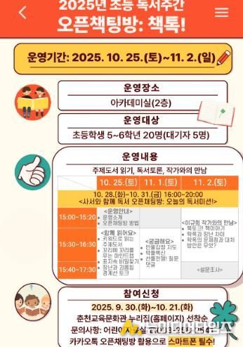 춘천교육문화관은 책 읽기 좋은 계절인 가을을 맞아 오는 10월 25일, 10월 28일부터 11월 2일까지 초등학생 5~6학년 학생 20명을 대상으로 초등 독서주간 ‘오픈책팅방 책톡!’을 운영한다.