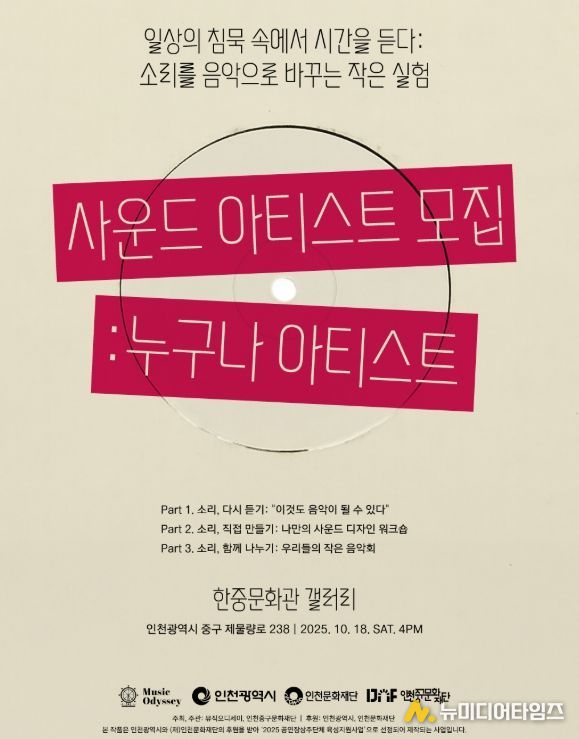 (재)인천중구문화재단은 상주단체 ‘뮤직오디세이’의 시민참여 퍼블릭프로그램 〈일상의 침묵 속에서 시간을 듣다'에 함께할 참가자를 선착순 모집한다고 1일 밝혔다.
