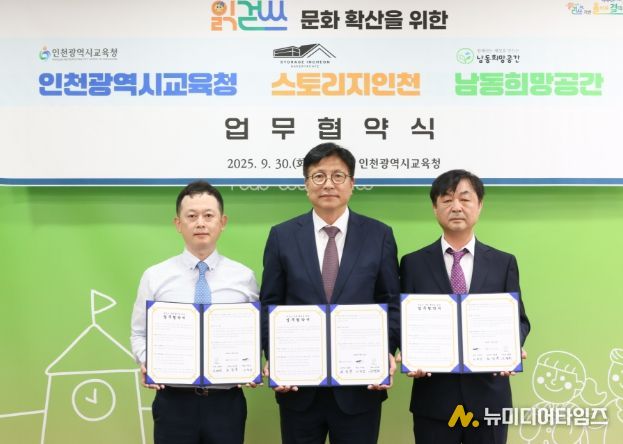 인천광역시교육청은 9월 30일 ㈜월미하이랜드(대표 이덕성) 스토리지인천, 남동희망공간(대표 유병희)과 함께 ‘읽걷쓰’ 문화 확산을 위한 업무협약을 체결했다.