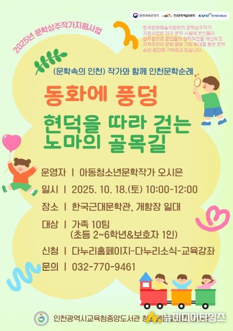 인천광역시교육청중앙도서관은 10월 18일 오전 10시부터 12시까지 오시은 상주작가와 함께하는 인천문학순례를 운영한다.