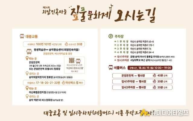 한편 시는 궁평(송악)저수지황톳길 주차장, 서남대부근 공터 등 2개소의 임시주차장을 마련하고 20분 간격으로 셔틀버스를 운행하며, 온양온천역에서 행사장까지 40분 간격으로 셔틀버스를 운행할 계획으로 방문객들의 편의 제공에 최선을 다하겠다고 전했다.