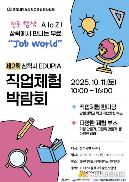 삼척시와 EDUPIA삼척교육발전사업단은 오는 10월 11일 오전 10시 강원대학교 삼척캠퍼스 잔디광장에서 ‘제2회 삼척시 EDUPIA 직업체험 박람회’를 개최한다고 밝혔다.
