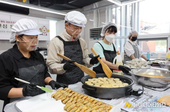 김찬진 청장과 자원봉사자들이 만든 전 3종 세트(동그랑땡, 동태전, 오색꼬지전)와 사랑의 쿠키 꾸러미는 지역 내 취약계층 110가구에 전달됐다.