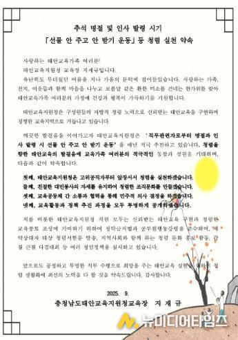 충청남도태안교육지원청은 추석 연휴 시기를 맞아 청렴한 공직문화를 확산하기 위해 ‘선물 안 주고 안 받기 운동’을 강조하는 청렴 서한문을 홈페이지에 게시했다.