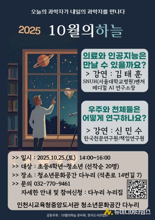 인천광역시교육청중앙도서관 청소년문화공간 다누리는 10월 25일 토요일 오후 2시 청소년을 대상으로 과학자들의 재능기부 강연 프로그램 ‘10월의 하늘’을 개최한다.