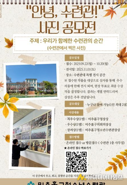 인천 미추홀구청소년수련관은 수련관 이전을 앞두고 지난 30여 년간의 추억을 함께 기록하기 위해 ‘안녕, 수련관’ 사진 공모전을 진행하고 있다고 2일 밝혔다.