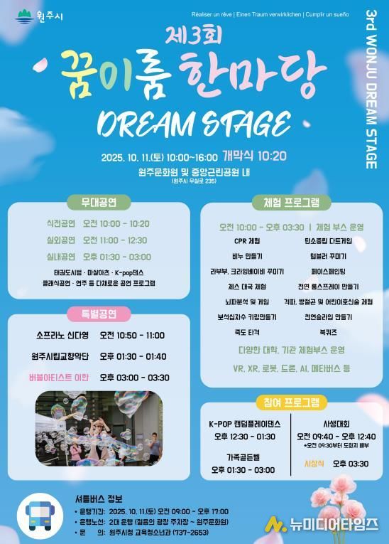 이번 행사에서는 ‘K-POP 데몬헌터스 주제가’ 등 인기곡에 맞춰 자유롭게 댄스 실력을 뽐내는 랜덤플레이댄스를 비롯해 소프라노 신다영, 원주시립교향악단, 버블아티스트 이한의 초청 공연 무대가 준비됐다.