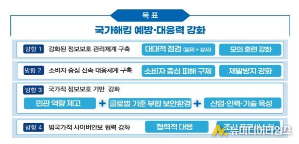 과학기술정보통신부와 관계부처는 전방위적인 해킹 사고로 국민 불안이 가속화되는 현 상황을 신속히 극복하고 국가 전반의 정보보호 역량을 강화하기 위해 '범부처 정보보호 종합대책'을 수립하여 10월 22일 대국민 브리핑을 통해 발표했다.