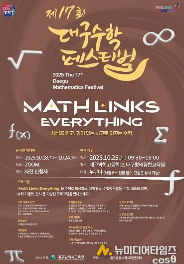 대구시교육청이 주최하고 대구중등수학교육연구회가 운영하는 ‘제17회 대구수학페스티벌’이 10월 25일 9시 30분부터 대구과학고 및 대구창의융합교육원에서 'Math Links Everything(수학은 모든 것을 연결한다)'이라는 주제로 개최된다.
