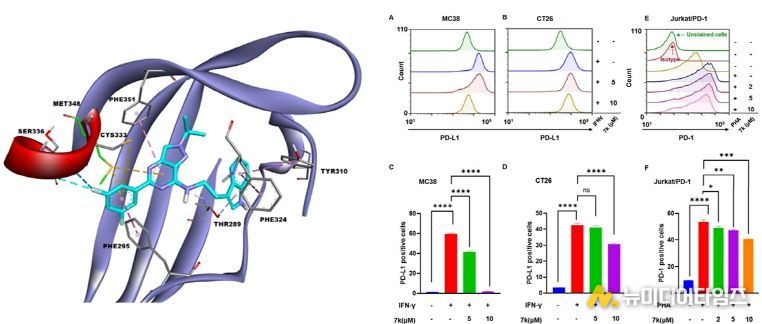 또한, 7K 화합물은 대장암 세포주에서 아릴하이드로카본 수용체 관련 유전자와 PD-1/PD-L1 면역회피 경로의 발현을 억제하는 동시에 정상 대장 세포에는 영향을 주지 않는 선택적 항증식 효과를 보여 면역항암 병용치료로써의 새로운 가능성을 제시했다.