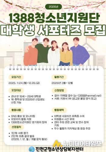충북 진천군청소년상담복지센터는 이달 24일부터 대학생 대상 서포터즈 프로그램 ‘2026년 1388청소년지원단 대학생 서포터즈’ 참가자를 모집한다고 밝혔다.