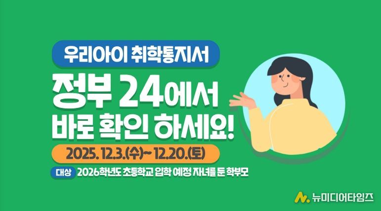 한편, 12월 10일부터 20일까지는 취학아동명부를 기반으로 취학통지서가 우편(등기)으로 발송될 예정이다. 문의사항은 거주지 관할 동 행정복지센터로 연락하면 된다.
