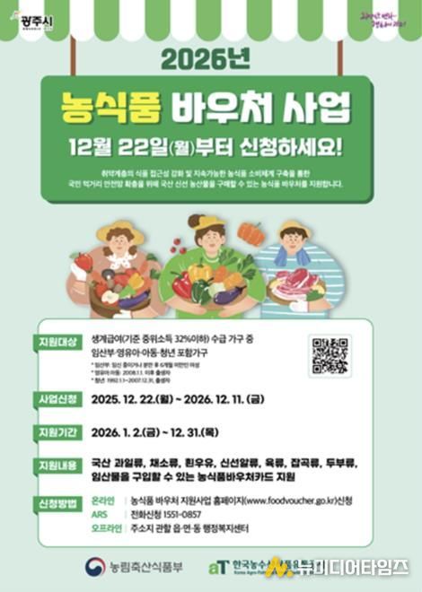 광주시는 취약계층의 균형 있는 식품 섭취 지원과 지속가능한 농식품 소비 기반 확충을 위해 저소득 가정에 신선 농산물 구매를 지원하는 ‘농식품 이용권 사업’을 2026년 1월 2일부터 본격 시행한다고 17일 밝혔다.