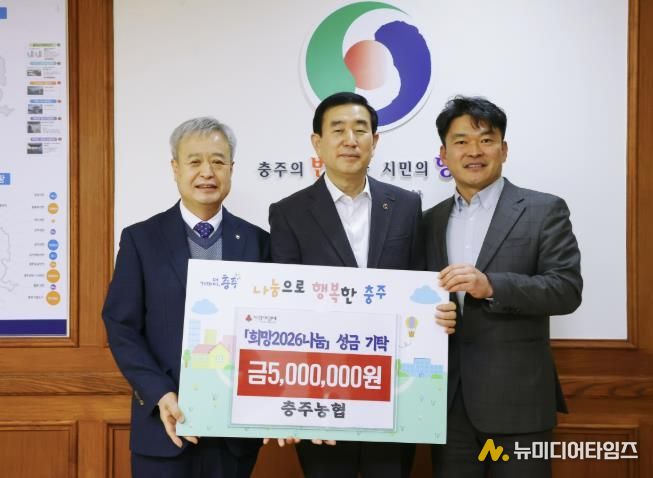 충주농협은 시청을 방문해 ‘희망2026나눔캠페인’ 기금 500만 원을 기탁하면서 지역사회를 훈훈하게 하고 있다.
