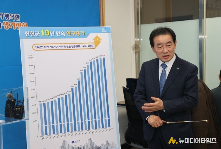 충북 진천군이 2025년에도 인구증가 기록을 이어가며 연속 인구증가 기록을 18년에서 19년으로 갈아치웠다.