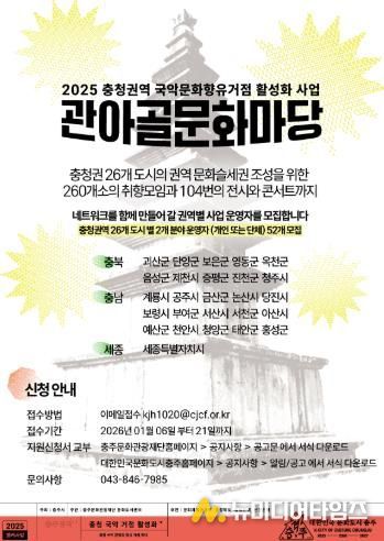 충주문화관광재단과 충주시는 정부의 지방시대 핵심 비전인 ‘5극 3특(5대 초광역권 및 3대 특별자치도)’ 전략에 발맞춰, 충청권역의 문화적 연대를 강화하고 지역 균형 성장을 견인할 '충청권 국악문화향유거점 활성화 사업' 운영자를 오는 21일까지 공개 모집한다.