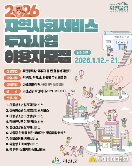 충북 괴산군은 오는 12일부터 21일까지 읍·면 행정복지센터에서 2026년 상반기 지역사회서비스투자사업 이용자 모집한다고 9일 밝혔다.
