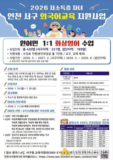 인천 서구는 저소득층 자녀에게 양질의 외국어 교육을 지원함으로써 교육 기회의 형평성을 제고하고 글로벌 시대에 걸맞는 인재로 성장할 수 있는 기반을 마련하고자 관내 저소득층 자녀를 위한 외국어교육 지원 사업을 3월부터 시행한다.