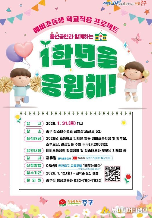 인천시 중구는 새 학기를 앞두고 오는 31일 오전 11시 영종국제도시 소재 중구청소년수련관 공연장에서 ‘예비 초등생 학교적응 프로젝트 - 1학년을 응원해!’를 개최한다고 밝혔다.