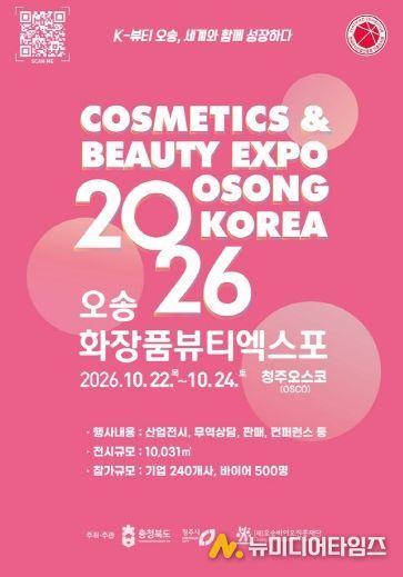 충북도와 청주시는 1월 14일부터 화장품·뷰티산업의 트렌드를 선도하고, 국내 화장품 기업의 판로 개척을 지원하는 ‘2026 오송화장품뷰티엑스포’의 참가기업 및 공식후원사 모집을 시작한다.