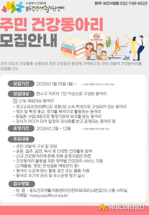 연수구 송도건강생활지원센터는 주민들의 자발적인 건강 증진 활동을 지원하기 위해 오는 19일부터 ‘주민 참여형 건강동아리’를 모집한다.