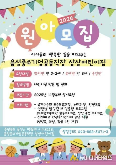 음성군은 중소기업 근로자의 보육환경 개선과 일·가정 양립 문화 확산을 위해 운영 중인 중소기업 공동직장어린이집 ‘상상어린이집’의 원아를 모집한다.