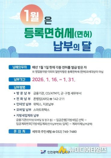연수구는 2026년 정기분 등록면허세(면허)로 4만 9천여 건에 17억 원을 부과했다.