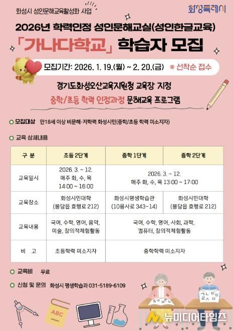 화성특례시는 19일부터 2월 20일까지 2026년 성인을 위한 한글교실 ‘가나다학교’ 및 ‘늘배움학교’ 수강생을 선착순 모집한다고 19일 밝혔다.